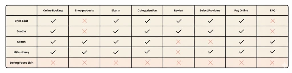 The analysis shows that while market leaders invest heavily in clear booking flows, transparent pricing, and trust-building content, Saving Faces’ original site lacks most of these foundations. This gap shaped our redesign strategy: focus on clarity, trust, and a truly modern booking experience.