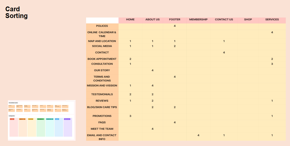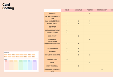 We ran a card sorting exercise with participants to see how they would group pieces of content like services, testimonials, promotions, and FAQs.