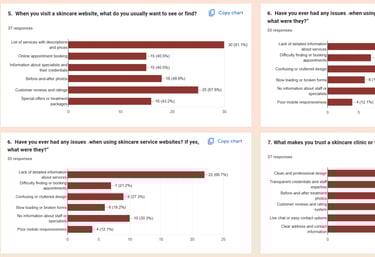 We collected responses from potential and existing skincare clients to understand what builds trust and what frustrates them when researching clinics online.