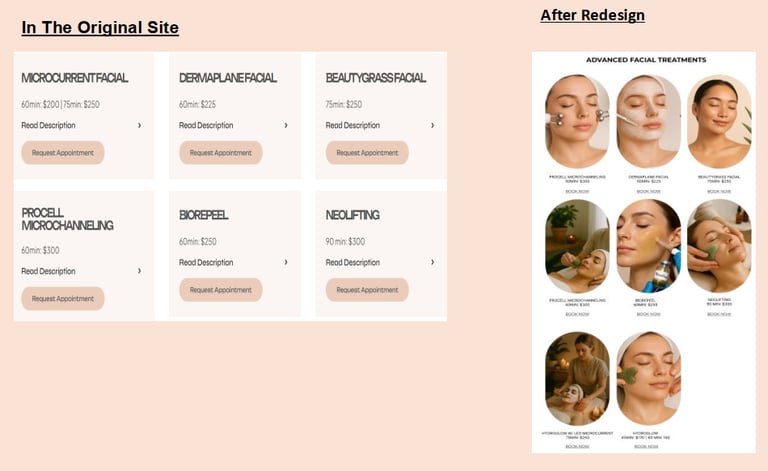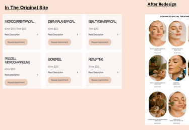 A full UX/UI redesign that turns a confusing clinic site into a clear, confidence-building experience. We reorganized services and pricing, highlighted safety and before/after proof, introduced esthetician bios, and simplified the booking flow.