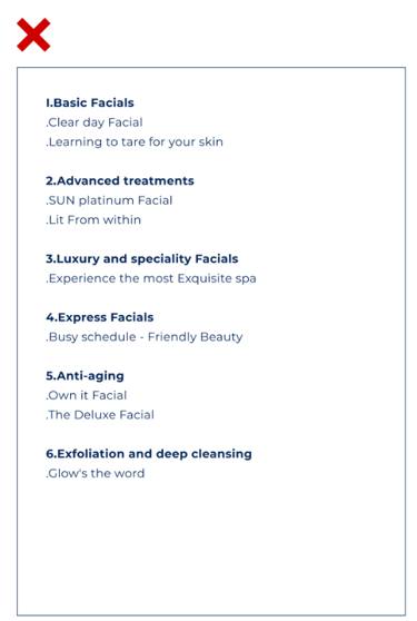 Observation: Terms like “Corrective Facials” may be unclear to non-experts.
